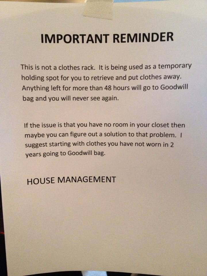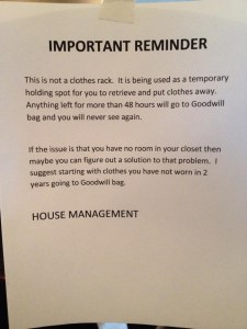 Our first home…magical. It’s so mind-blowing to me that a little over a year ago we were trying to convince my dad to “invest” in a house for Sam and I. At the time we considered ourselves gypsies. We lived between his grandparents farm (it’s hard to explain but it’s basically a separate apartment attached but not attached to the main house) and my dad’s house. The gypsy stage of our lives could be it’s own blog post. Here’s just a little preview: My dad (we called each other roommates at the time) shared many in-depth, sophisticated chats over Saturday morning breakfast. There were many times I left my dad speechless. Particularly the time I suggested playing rock, paper, scissor with China to help come to an agreement on the debt situation. Another time he locked me out of the house while I was wearing a sweatshirt far too large for me, leggings and my bright pink Snuggie with a kangaroo pouch. I think some of my favorite roommate times were the notes I would receive from “management” aka, my dad. Here’s an example: