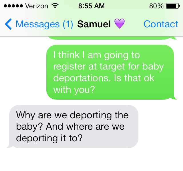 *One morning I was texting with Sam talking about baby things. I asked his opinion on registering at Target, along with Babies R Us, since they have more decorations for the nursery. Here’s the outcome: